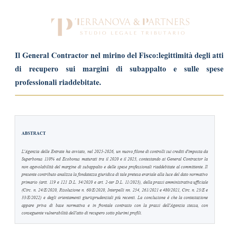 A distanza di tre anni dall'avvio del regime di cessione dei crediti fiscali ex art. 121 D.L. 34/2020, l'attività di controllo dell'Agenzia delle Entrate e della Guardia di Finanza si è orientata su un nuovo bersaglio: le imprese che hanno operato quali General Contractor (GC) negli interventi agevolati da Superbonus 110% ed Ecobonus, prevalentemente nel segmento condominiale.